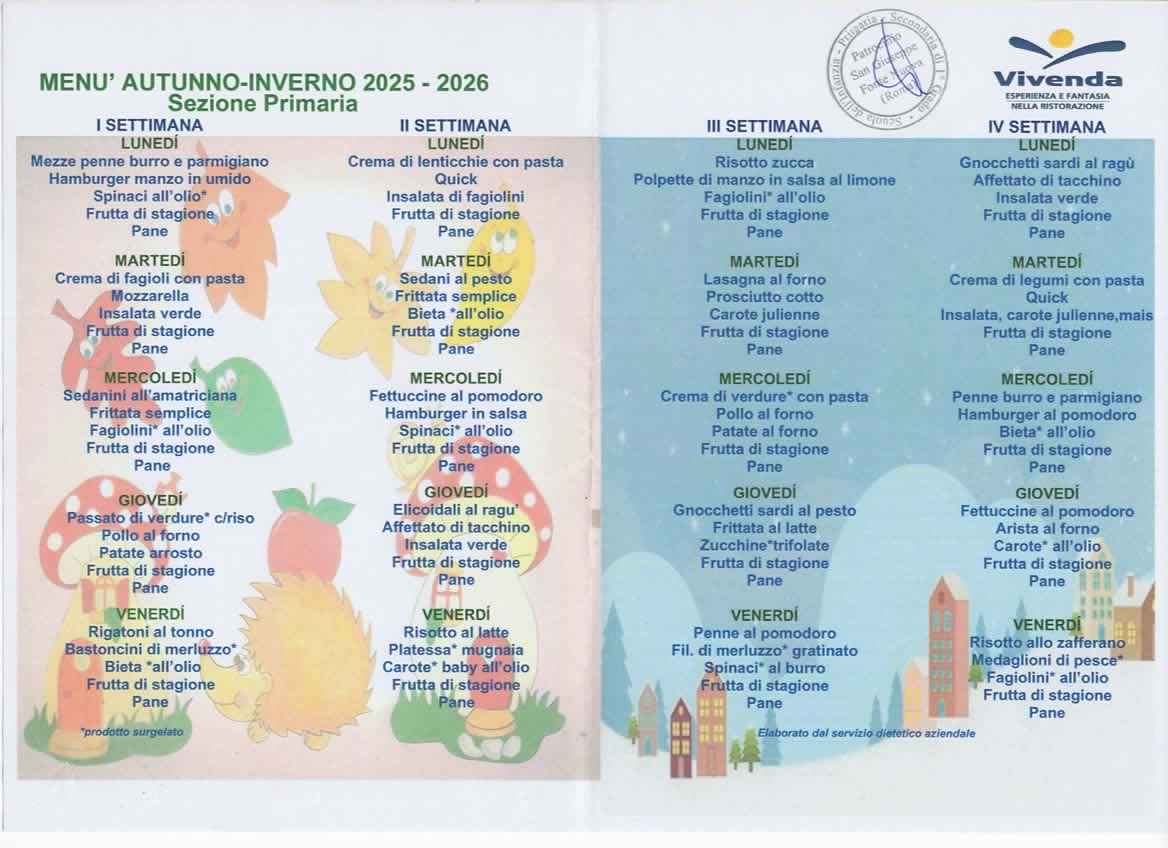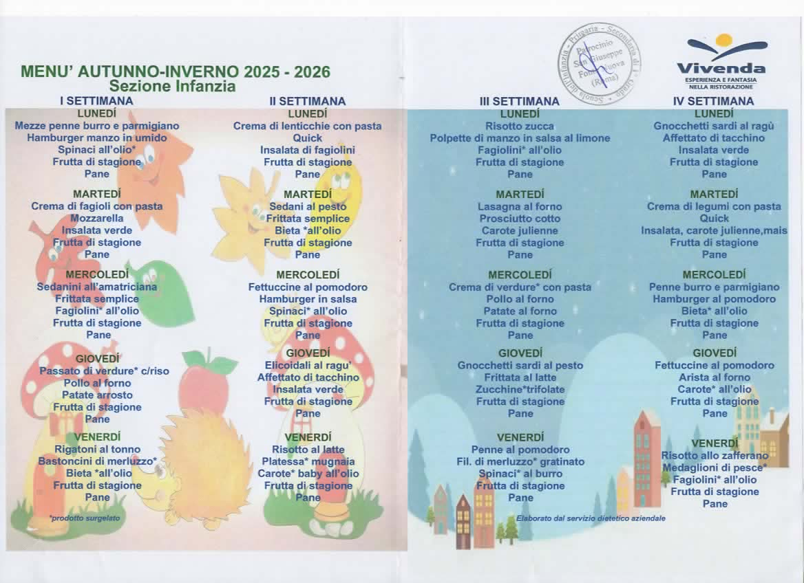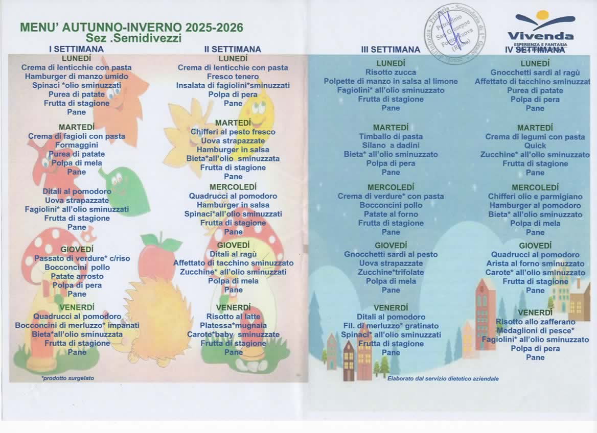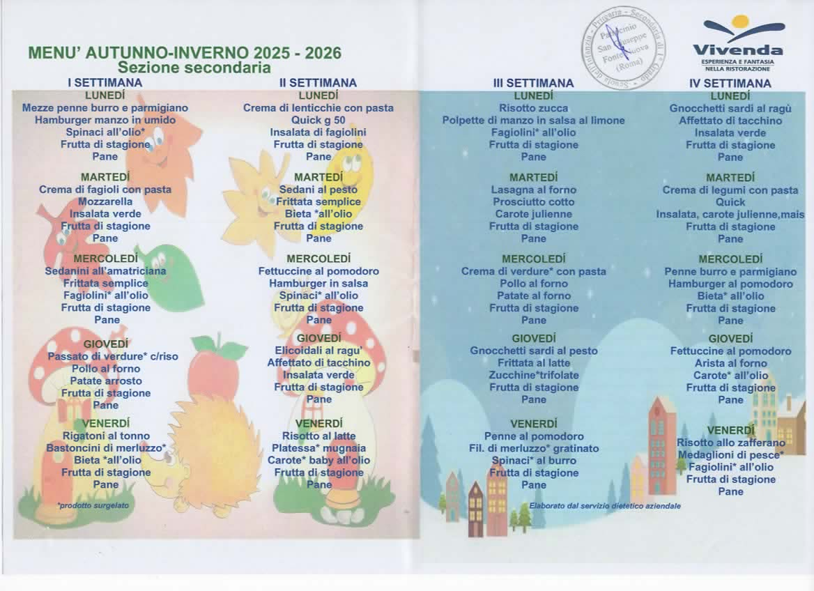 Il menù viene suddiviso su quattro settimane garantendo così una varietà di pietanze anche per chi usufruisce di un servizio parziale. Comporta un menù invernale da novembre ad aprile e un menù estivo.